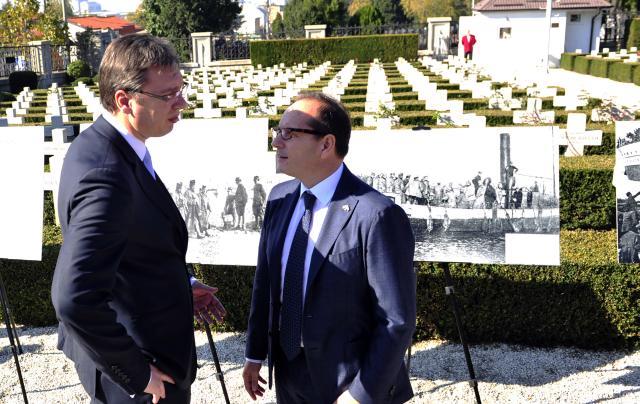 BEOGRAD - Svečanim otkrivanjem Spomen ploče na Italijanskom vojnom groblju premijer Srbije Aleksandar Vučić i ambasador Italije Đuzepe Manco odali su danas počast italijanskim vojnicima poginulim u Prvom svetskom ratu.