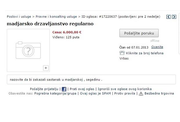 NOVI SAD - Na jednom domaćem portalu za oglašavanje pre dve nedelje postavljen je oglas u kojem se prodaje mađarsko državljanstvo. Kako se navodi u oglasu, državljanstvo se prodaje po ceni od 6.000 evra i to - regularno.