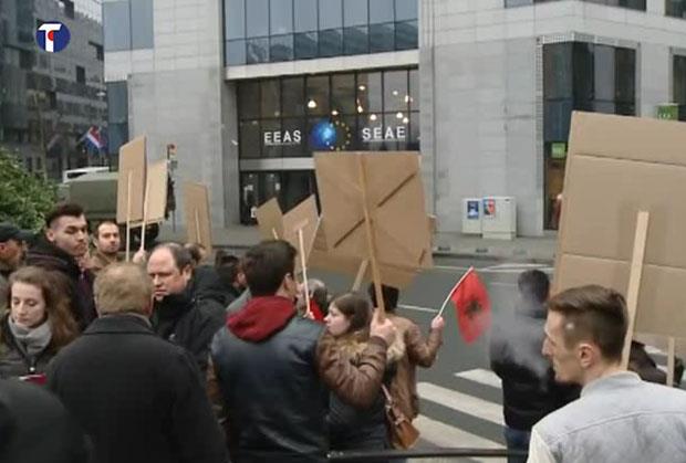 Izveštači agencije Tanjug pratili su protest grupe Albanaca sa Kosova koja je u ponedeljak na trgu Šuman javno protestovala protiv dijaloga Beograda i Prištine