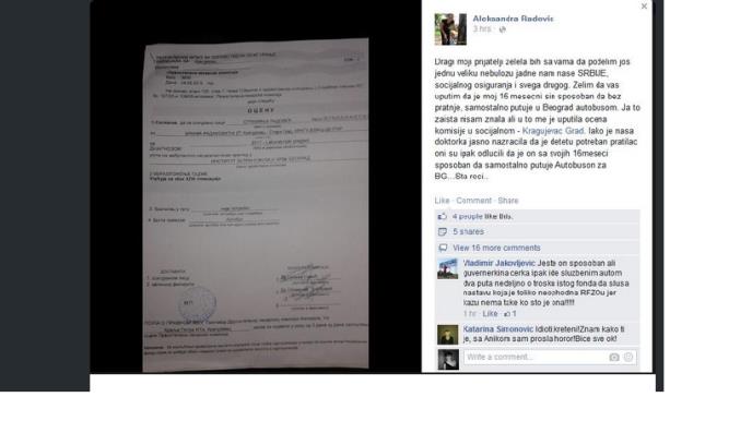 "Dragi moji prijatelji, želela bih da sa vama podelim još jednu veliku nebulozu jadne nam naše Srbije, socijalnog osiguranja i svega drugog. Želim da vas uputim da je moj 16 mesečni sin sposoban da bez pratnje, samostalno putuje u Beograd autobusom. Ja to zaista nisam znala, ali me je u to uputila ocena komisje RFZO. Iako je naša doktorka jasno naznačila da je detetu potreban pratilac, oni su ipak odlučili da je on sa svoji 16 meseci sposoban da samostalno putuje autobusom za Beograd. Šta reći...", napisala je Radovićeva ba svom Fejsbuk nalogu.
