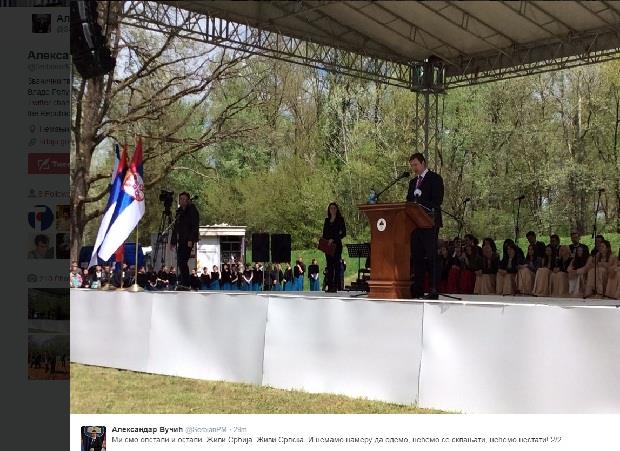 "Danas nedaleko od Okamenjenog cveta u Jasenovcu jasno kažemo: Ne pristajemo na srmt, čuvaćemo svoju srpsku otadžbinu, borićemo se za život bez želje da se ikada svetimo ali bez namere da ikada zaboravimo. Na to nas niko ne može naterati. Mali je taj vaš zločinački posao koliko su naše glave visoko i Srbija i Srpska velike, ne teritorijalno već duhovno, ne da bi nekoga napadale, već da bi prkosno opstajale i snažno napredovale. Na današnji dan kažemo ponosno i uzdignuta čela: Živela Srpska, živela Srbija, sloboda i večna slava onima koji su tu slobodu ovde napravili i nama u je amanet ostavili", zaključio je Vučić u svom govoru.