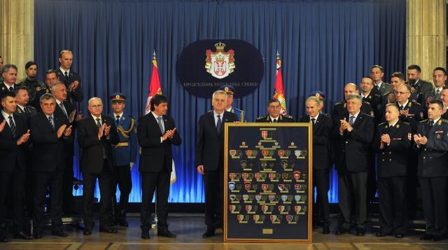 Predsedniku Srbije načelnik Generalštaba VS general Ljubiša Diković uručio je ambleme VS, a ministar odbrane Bratislav Gašić vojnu spomenicu za učešće na paradi "Korak pobednika" upriličinoj prošle godine na dan oslobođanja Beograda u Drugom svetskom ratu.