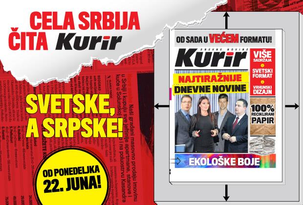 Vaše omiljene dnevne novine Kurir od sada u novom izdanju! Dnevne novine Kurir od ponedeljka 22. juna prelaze na novi - najmoderniji svetski format, koji će biti ispraćen modernim dizajnom, sadržajnijom ponudom vesti i ekološkom štampom na 100 % recikliranom papiru.