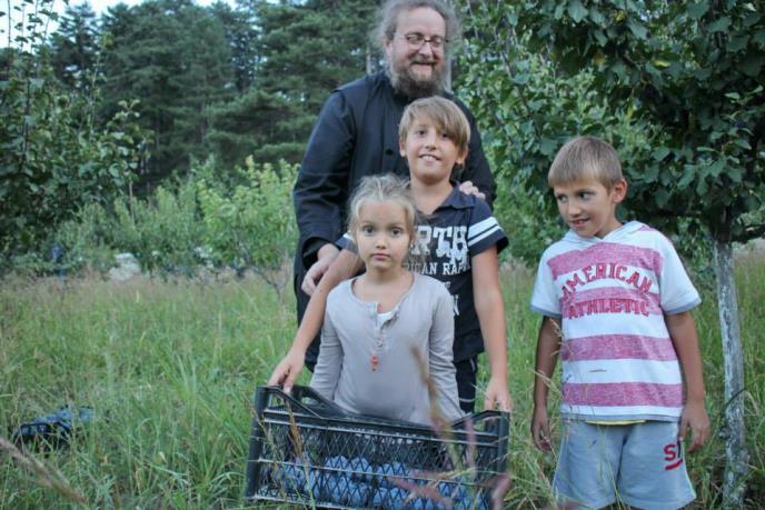 "Berba šljiva u našem manastirskom voćnjaku. Teško bih ja i bratija išta uradili bez naših malih pomagača: Vuka, Vasilija i Sofije", napisao je gospodin Janjić.