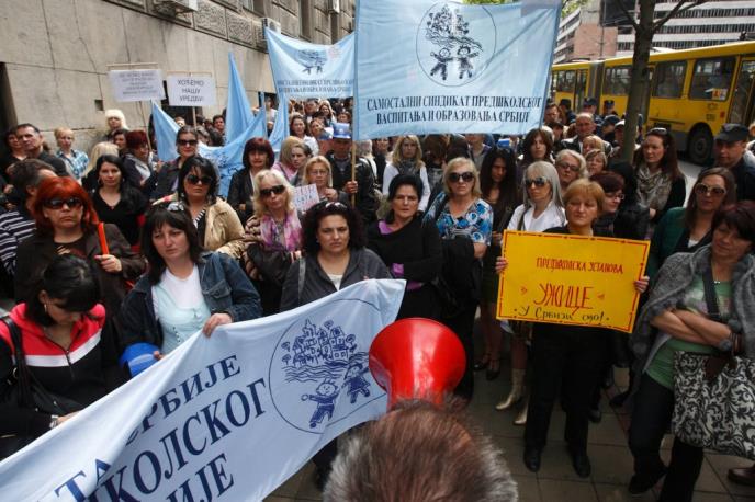 BEOGRAD - Oko 300 zaposlenih u predškolskim ustanovama u Srbiji protestuje ispred Vlade Srbije zahtevajući da se "hitno", do četvrtka 26. aprila, donese uredba o nivou plata zaposlenih u predškolskim ustanovama.