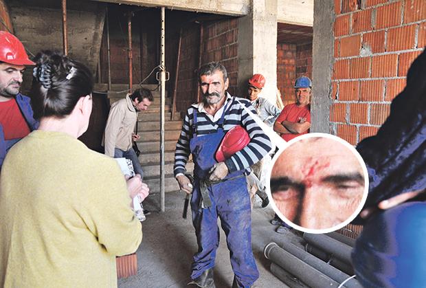 Jedan od radnika oko glave ima zavoje koji su nestručno zavijeni, pa se krv u predelu čela ipak vidi. Rana „stara“ nekoliko sati, reklo bi se.
