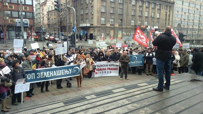 Više od tri stotine dužnika, koji imaju kredite u švajcarskim francima, otpočelo je protest najpre ispred NBS, a potom su isti nastavili ispred Vlade, gde su poručili da će ostati sve dok im se neko ne obrati i ne ponudi model za rešavanje njihovih problema.