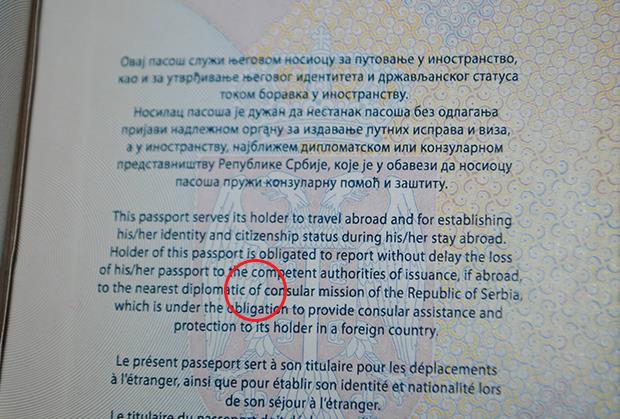 BEOGRAD - Na srpskom pasošu u segmentu na engleskom jeziku nalazi se greška.
