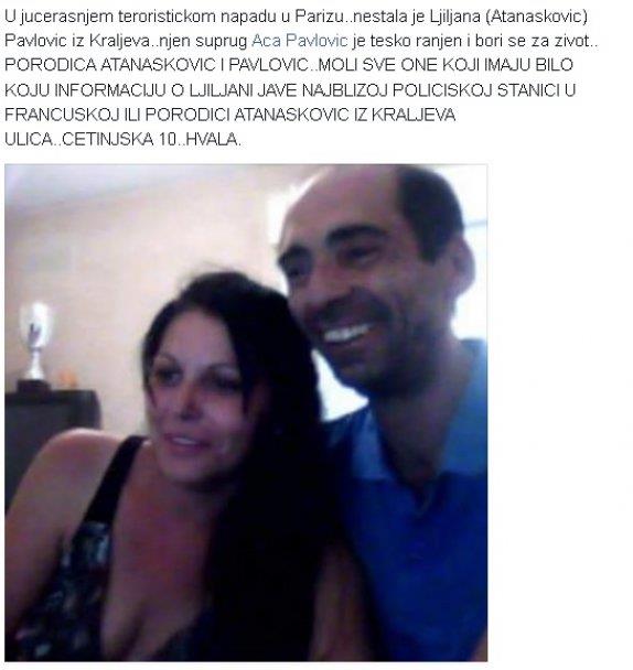 Ljiljana i njen suprug Aca Pavlović ranjeni su ispred Nacionalnog stadiona u Parizu u trenutku kada se terorista-samoubica Ahmed Almuhamed digao u vazduh. Podsetimo, Almuhamed je prošao kroz Srbiju kao migrant, a „Blic“ je ekskluzivno objavio njegovu fotografiju koja je obišla ceo svet.