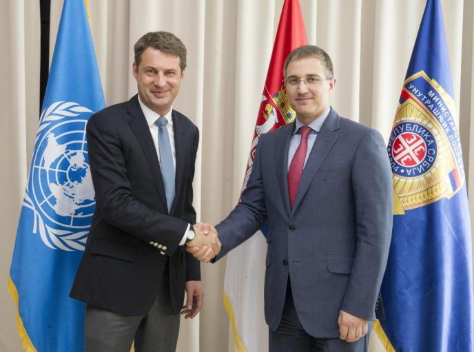BEOGRAD - Ministar unutrašnjih poslova Nebojša Stefanović i šef Predstavništva Visokog komesarijata za izbeglice Ujedinjenih nacija u Srbiji Hansom Fridrih Šoder razmotrili su danas najnovije događaje vezane za veliki priliv migranata i izbeglica u Evropu i njihovo tranzitiranje kroz zemlje Zapadnog Balkana.