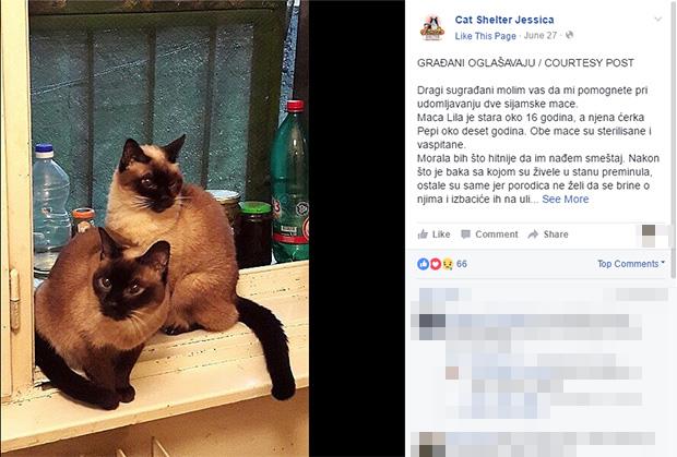 Maca Lila stara je 16 godina, a njena Pepi ima 10. Obe su sijamske mace, sterilisane, vakcinisane i naviknute na život u stanu. Godinama su živele kao kraljice – mažene, pažene i negovane s ljubavlju. Njihova vlasnica čuvala ih je do poslednjeg trenutka, sve do smrti...
