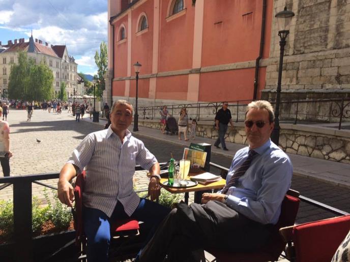 Ambasador Srbije u Sloveniji Aleksandar Radovanović i savetnik u ambasadi BiH Mirsad Muhović piju kafu na Tromostovlju.
