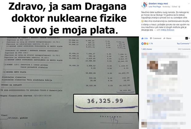 Naime, na Fejsbuk stranici "Građani imaju moć" objavljena je fotografija na kojoj je se nalazi iznos plate osobe koja se zove Dragana i za sebe tvrdi da je doktor nuklearne fizike.