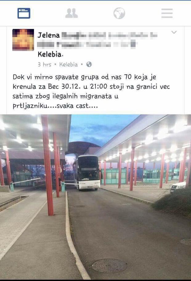 Dok vi mirno spavate, grupa od nas 70 koja je krenula za Beč 30.12 u 21 stoji na granici satima zbog ilegalnih migranata u prtljažniku... svaka...čast, napisala je na svom Fejsbuk profilu devojka po imenu Jelena ogorčena zbog dugog čekanja na granici.