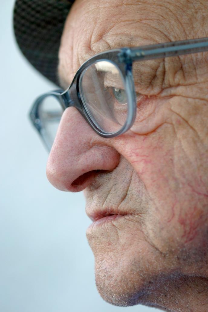 On ima oko 75 godina. Ima prastari mantil, pantalone i još starije cipele. Ulazi u poštu i ljubazno pita radnicu da li još uvek rade govornice i da li može da telefonira. Radnica bez trunke emotivnog investiranja odgovara da može. On ulazi u srednju govornicu, vrata se ne mogu u potpunosti zatvoriti i započinje razgovor.