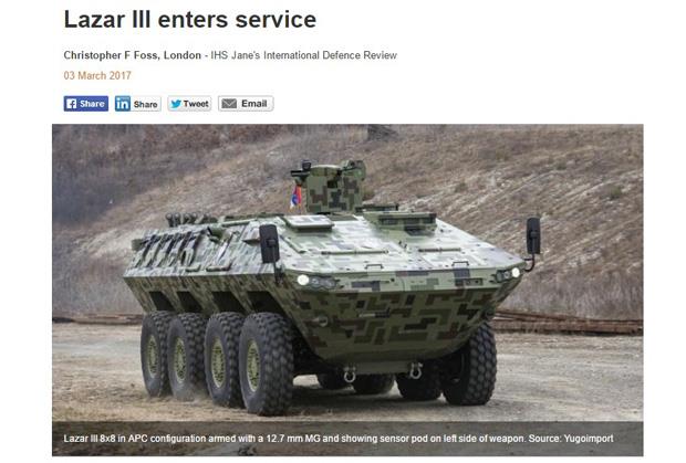 Ugledni vojni portal „Džejns“ predstavio je srpsko oklopno vozilo "Lazar 3" ističući njegovu snažnu čeličnu šasiju, pogon na svih osam točkova kao i sofisticiranu modularnu balističku zaštitu.