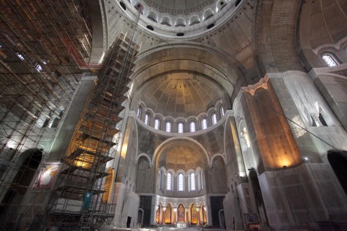 Proverava se svaki kamenčić, svaki staklić i strogo se vodi računa o svakoj nijansi. Tako nastaje slika za kupolu koja će u prečniku imati čak 30 metara. Mozaik za kupolu teži 40 tona, a svako pričvršćeno parčence mozaika može da izdrži opterećenje od čak 20 tona! Površina kupole je 1.230, a oltara 3.167 kvadratnih metara.