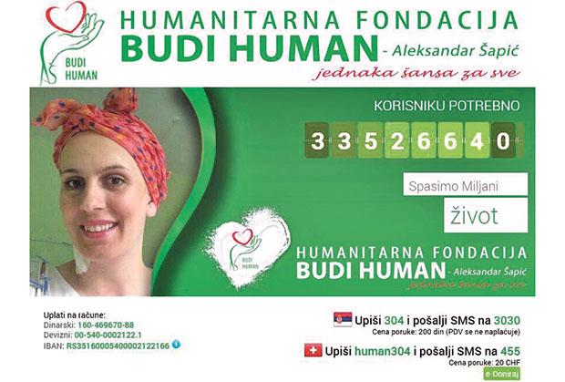 VRANJE - Humanitarna fondacija „Budi human - Aleksandar Šapić“, prikuplja novčana sredstva za Miljanu Ristić Stanković (31) iz Vranja. Miljani je dijagnostikovana akutna mijeloblastna leukemija bez sazrevanja - AML-M1.