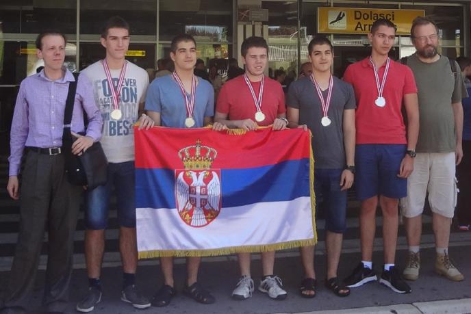Srpski tim sastavljen od petorice gimnazijalaca, koji je ostvario istorijski uspeh na Međunarodnoj fizičkoj olimpijadi u Indoneziji osvojivši jednu zlatnu i četiri srebrne medalje, doputovao je danas u Beograd.
