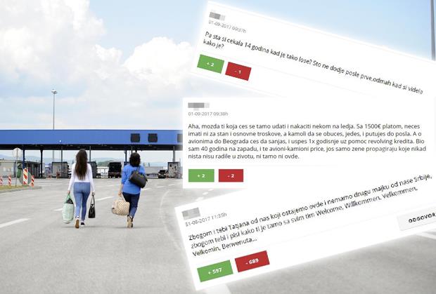 "Aha, možda ti koja ćeš se tamo udati i nakačiti nekom na leđa. Sa 1.500 evra platom, nećeš imati ni za stan i osnovne troškove, a kamoli da se obučeš, jedeš, i putuješ do posla. A o avionima do Beograda ćeš da sanjaš, i uspeš jednom godišnje uz pomoć revolving kredita. Bio sam 40 godina na zapadu, i te avioni-kamioni priče, još samo žene propagiraju koje nikad ništa nisu radile u životu, ni tamo ni ovde",