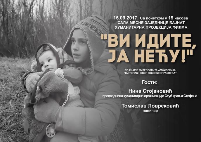 Humanitarna organizacija „Stub kralja Stefana“ organizovaće 17. septembra u 19 časova humanitarne projekcije filma o stradanju Srba na Kosovu i Metohiji „Vi idite, ja neću“ u trideset gradova u Srbiji i regionu, kako bi još jednom probudili srpsku javnost i podigli svest o značaju Kosova i Metohiji.