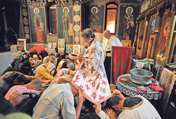 Prvo su nepomični, a zatim mladić sve češće pruža ruku ka zabrađenoj ženi ispred sebe. Počinje da se oglašava kricima. Tada mu pride arhimandrit Isaija. Uzme mu glavu među šake, palčevima pritisne početke obrva, i mladić ućuti.