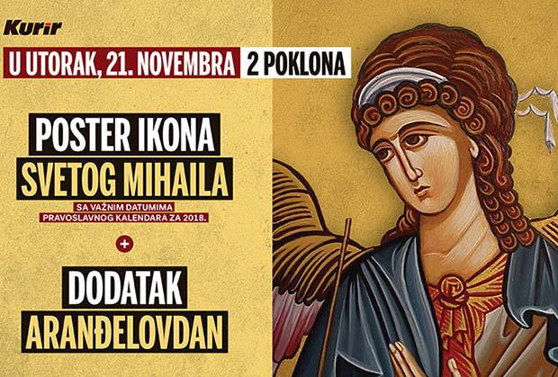 U utorak, 21. novembra, Srpska pravoslavna crkva proslavlja Aranđelovdan u slavu svih anđela i prvog među njima, svetog arhangela Mihaila. Tim povodom, dnevne novine Kurir svojim čitaocima daruju dva poklona: veliki poster sa ikonom Svetog Mihaila i slavski dodatak posvećen Aranđelovdanu.