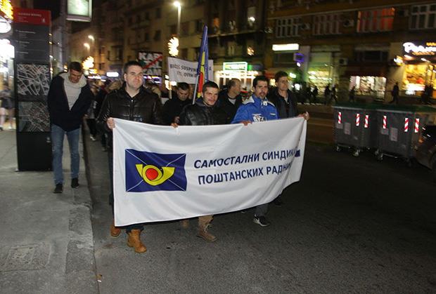 Prema rečima predsednika Samostalnog sindikata poštanskih radnika Zorana Pavlovića, učesnici protesta su večerašnjom mirnom šetnjom, transparentima, pištaljkama, pokazali da od zahteva ne odustaju.