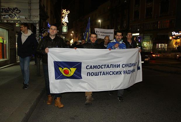 BEOGRAD - Samostalni sindikat poštanskih radnika saopštio je danas da poslovodstvo uskraćuje radnička prava, pravo na sindikalno organizovanje i delovanje i najavio da će od 21. decembra svakodnevno organizovati protestne šetnje od Pošte do Vlade zahtevajući vraćanje na posao 37 suspendovanih radnika.