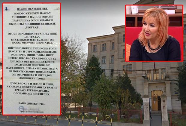 "Ovo je obrazovna ustanova, nije estrada. Vi se školujete za jednu od najodgovornijih profesija. Pirsing, nokti, silikoni, goli dekoltei i strukovi, pocepane farmerke, mini suknje, nisu nešto što vas kvalifikuje za diplomu ove škole. Da biste zaslužili poštovanje nastavnika, lekara i pacijenata, vi morate svojim ponašanjem, odgovornošću i izgledom doprineti tome! Dovoljno ste i mladi i lepi, a sa nama i obrazovani, da vam ne trebaju trećerazredna oponašanja neuspelih", stoji u obaveštenju direktorke Trifković.
