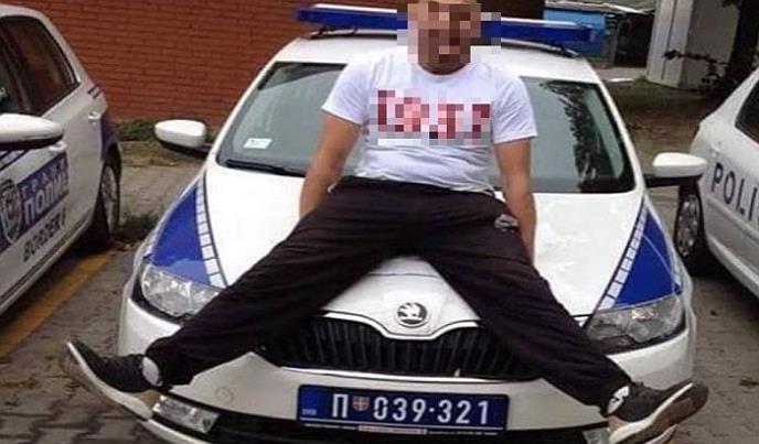 Na fotografiji koja se 30. avgusta pojavila na Instagramu vidi se ovaj Novosađanin kako sedi na policijskom automobilu na parkingu kod stanice policije na Satelitu, sa isplaženim jezikom i porukom ispod fotografije "A.C.A.B", što znači "All Cops Are Bastards", odnosno "Svi policajci su kopilad".