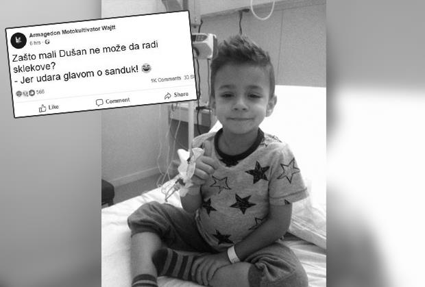 "Zašto mali Dušan ne može da radi sklekove? - Jer udara glavom o sanduk!" - glasi ovaj status koji je postavio na Fejsbuku neko ko se predstavlja kao “Armagedon Motokultivator Wajtt” .
