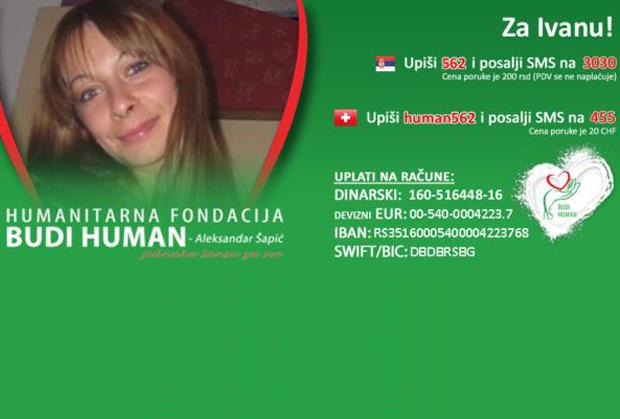 Ivana je majka dvoje male dece, obraća se svim ljudima dobre volje da pomognu u skladu sa svojim mogućnostima kako bi što pre otišla u inostranstvo na nastavak lečenja, jer su iscrpljene sve mogućnosti daljeg lečenja u zemlji, a vreme joj nije saveznik.