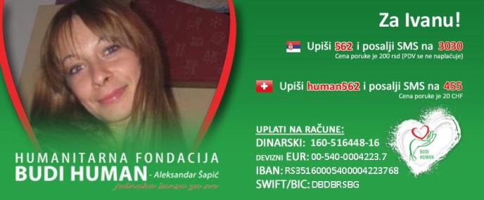 U restoranu "Garden vista" danas se održava veliko humanitarno veče sa brojnim poznatim ličnostima, a dolazak je potrebno prijaviti na mejl: ivanbiljicŽgmail.com. Takođe, otvoren je i SMS broj, a upisom 562 i slanjem na 3030 možete pomoći ovoj mladoj mami.
