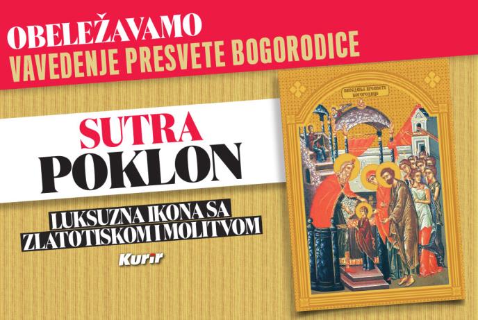 Srpska pravoslavna crkva i njeni vernici sutra slave Vavedenje Presvete Bogorodice, jedan od najvećih hrišćanskih praznika. Prema predanju, Bogorodica je jedina žena koja je stupila na tlo Svete gore na svom misionarskom putovanju po povratku iz Svete zemlje. Kurir vam sutra poklanja luksuznu ikonu u zlatotisku sa molitvom.
