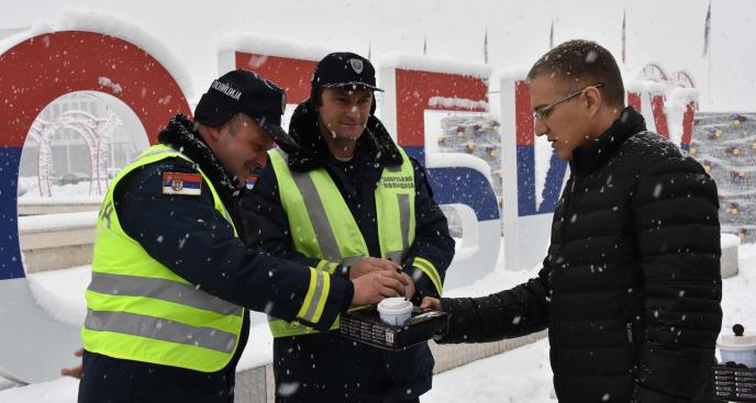 Kao mali znak pažnje, ministar je pripadnicima saobraćajne policije doneo i toplu kafu kako bi se, makar malo, ugrejali u ovom hladnom danu.