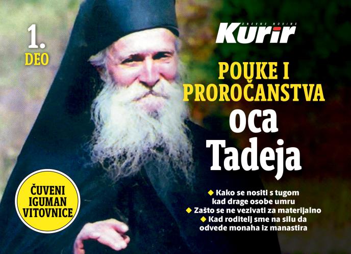 Kurir danas poklanja dodatak Pouke i proročanstva oca Tadeja u kojem su sabrana proročanstva i misli ovog velikog mudraca. U današnjem dodatku saznaćete šta je govorio i savetovao o tome kako da se nosite sa tugom kad draga osoba premine, zašto se ne treba vezivati za materijalno, kad roditelj sme na silu da odvede monaha iz manastira.