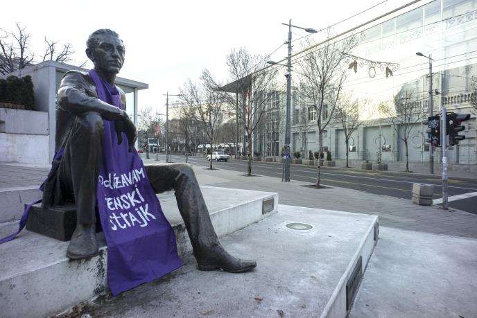 Natpis "Podržavam ženski štrajk" i kecelja postavljene su i na spomenik piscu Borislavu Pekiću na Cvetnom trgu.