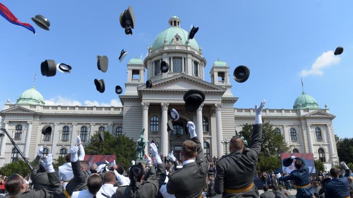 Tradicionalnim bacanjem šapki u vazduh danas je ispred Doma Narodne skupštine završena promocija najmlađih oficira Vojske Srbije.