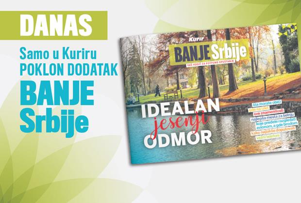 Danas ćete uz dnevne novine Kurir dobiti poklon dodatak BANJE SRBIJE - VAŠ VODIČ ZA POTPUNO OPUŠTANJE, u kome ćete imati prilike da pročitate korisne savete sa idealan jesenji odmor: šta morate obići, kuda da odete na izlet, koje znamenitosti treba da posetite, koja su najlepša mesta za šetnju, koje predele treba da razgledate avionom, a koje brodom, kako najlakše da doputujete, koji su važni telefoni i još mnogo korisnih informacija.