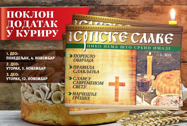 Dnevne novine Kurir vam poklanjaju tri poklon dodatka SRPSKE SLAVE. Prvi deo dobićete u ponedeljak, 4. novembra, drugi u utorak, 5. novembra, a treći u utorak, 12. novembra.