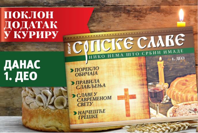 Danas vas u dnevnim novinama Kurir čeka poklon dodatak Srpske slave - niko nema što Srbin imade, u kom ćete imati priliku da pročitate o poreklu običaja, pravilima slavljenja, kako se slave slave u savremenom svetu i koje su najčešće greške pri obeležavanju slave.