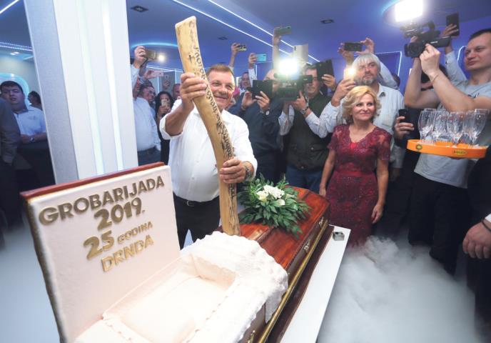 Radiša Mihajlović iz Požarevca, vlasnik čuvenog pogrebnog preduzeća „Drnda internacional“, koje je najčuvenije po sloganu „Vaše je samo da umrete, ostalo je naša briga“, u subotu je organizovao desetu, jubilarnu Grobarijadu u Požarevcu, a ovom proslavom je obeležio i 25 godina rada i odlazak u zasluženu penziju. Ispred restorana goste je čekala kočija iz 1930, ali i moderni „mercedes“, da se vidi kako su se nekad prevozili pokojnici, a kako se to danas čini. Unutrašnjost je bila dekorisana u skladu s proslavom, a nisu izneverile ni zvanice: doterani, veseli, s rukama punim poklona i cveća. Svadbarsku atmosferu malo su „kvarile“ devojke na ulazu s velovima preko lica, crnim rukavicama do lakata i haljinama u istoj boji.