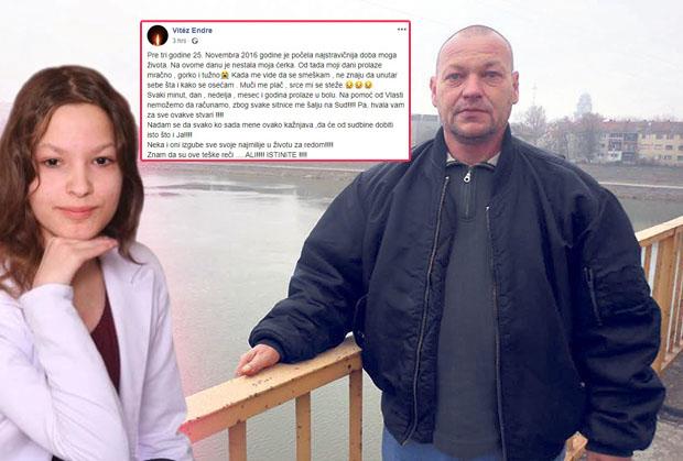 - Pre tri godine 25. novembra 2016. godine počelo je najstravičnije doba moga života. Na ovaj dan je nestala moja kćerka. Od tada moji dani prolaze mračno, gorko i tužno. Kada me vide da se smeškam, ne znaju šta i kako se osećam. Muči me plač, srce mi se steže. Svaki minut, dan, nedelja, mesec i godina prolaze u bolu. Nadam se da svako ko sada mene ovako kažnjava, da će od sudbine dobiti isto što i ja! Neka i oni izgube sve svoje najmilije u životu! Znam da su ove teške reči .... ALI ISTINITE!!!! - napisao je Endre.