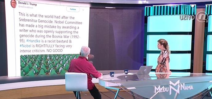 Stupar se, naime, obrukao u emisji "Među nama" na TV Nova S, gde su na ogromnom ekranu pokazali lažni tvit s lažnog Trampovog profila, u kom navodno negativno komentariše dodelu Nobelove nagrade austrijskom piscu Peteru Handkeu, koji je poznat kao veliki prijatelj Srbije.