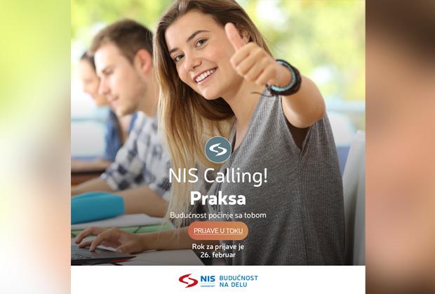 Ovogodišnji konkurs za „NIS Calling“ studentsku praksu otvoren je do 26. februara 2020. godine. Detaljnim procesom selekcije biće odabrano ukupno 80 studenata, a praksa će se odvijati u tri ciklusa. U toku su prijave za prvu grupu učesnika, njih 20, koji će praksu u NIS-u započeti u aprilu. Mesta održavanja prakse su Beograd, Novi Sad, Zrenjanin i Pančevo. Svi zainteresovani više informacija o programu i načinu apliciranja mogu da pronađu na sajtu kompanije NIS: https://www.nis.eu/nis-calling.