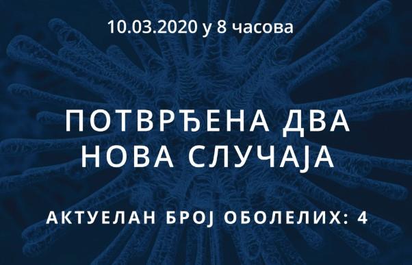 BEOGRAD - U Srbiji su potvrđena još dva slučaja zaraženih koronavirusom, tako da su ukupno zaražene četiri osobe, saopštilo je Ministarstvo zdravlja.