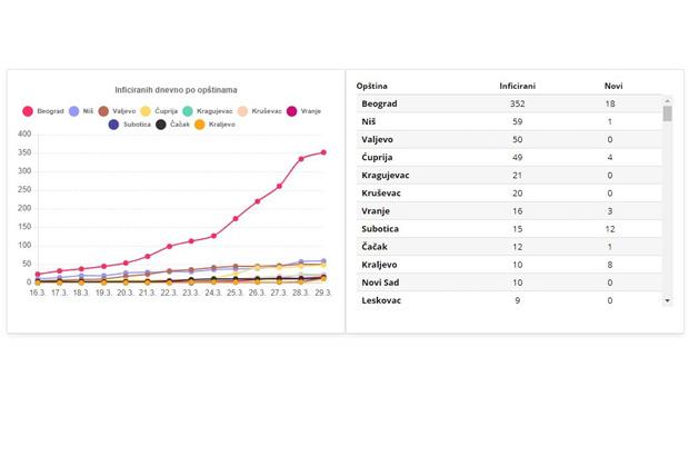 Nakon prestonice, sledi Niš sa 59 zaraženih i Valjevo gde ima 50 bolesnika. Za jedan manje ima Ćuprija.