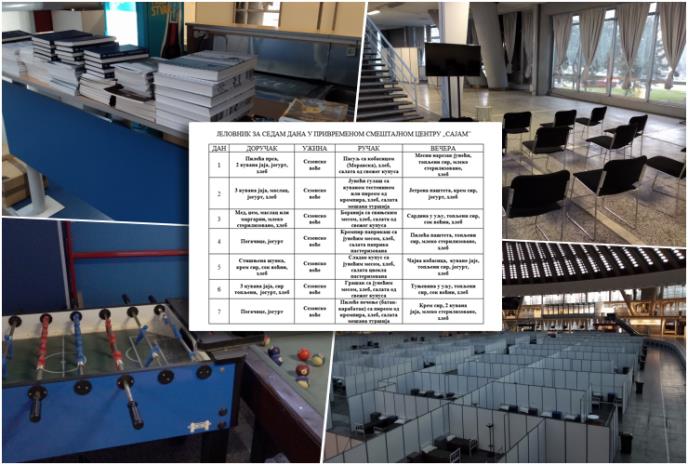 Vojska Srbije u Hali 1 uredila je prostor za smeštaj, za obedovanje i gledanje televizije, za verske potrebe, a na raspolaganju su i knjige, časopisi i dnevna štampa. Obezbeđeni su i tuševi za tuširanje i topla voda. Pacijenti imaju dnevno tri obroka i užinu, za ručak su kuvana jela, a ishranu obezbeđuje Studentski grad.