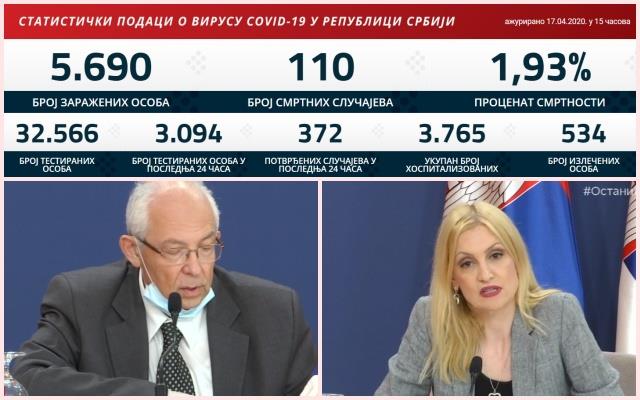 U poslednja 24 sata u Srbiji je registrovano još 372 osobe pozitivne na virus korona, ukupno 5.690 potvrđenih, a još sedam osoba je preminulo, ukupno 110, saopštio je epidemiolog Predrag Kon.